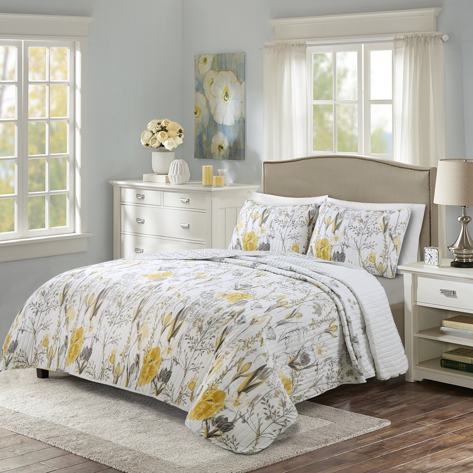 This Adalia 3 Piece Quilt Set comes complete with a cotton reversible quilt and two pillow shams. The print gives the look of a beautiful flowery meadow that brightens any bedroom. The picturesque flowers and butterflies pop off the white background. This set is available in your choice of full/queen and king sizes in purple or yellow.